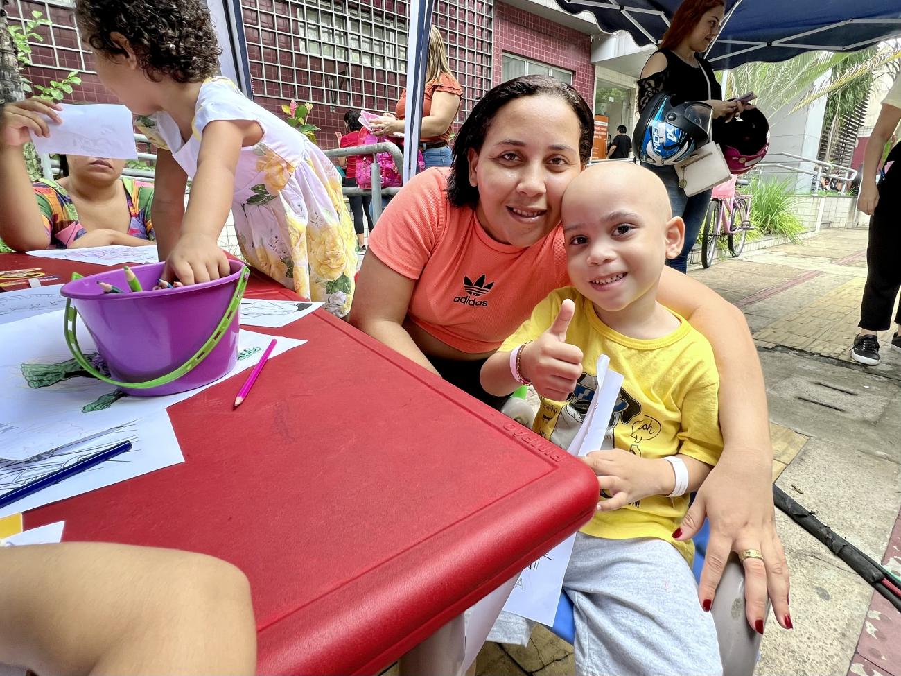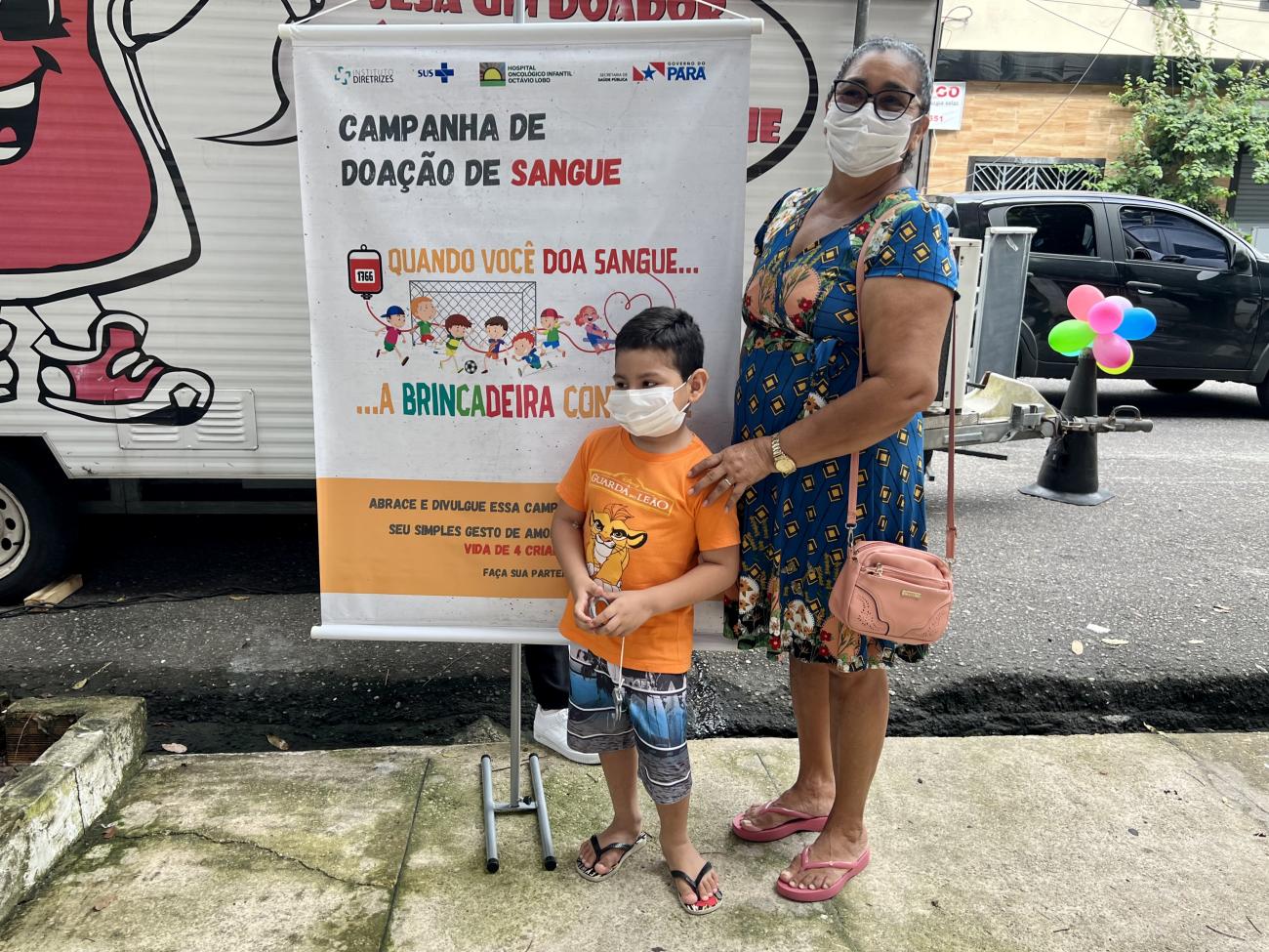 “Descobri que o meu filho tinha câncer na véspera de Natal do ano passado. Viemos para Belém, e o atendimento aqui no Hospital sempre foi muito bom. Mas tem coisas que não dependem só dos médicos, como a doação de sangue, que precisa da ajuda de outras pessoas. Por várias vezes o meu filho precisou de sangue e, graças ao cuidado que ele recebe e às doações, ele está bem”, informou Daiane.Maria das Dores Silva e o neto Caleb Fonseca, em frente a um banner da campanha