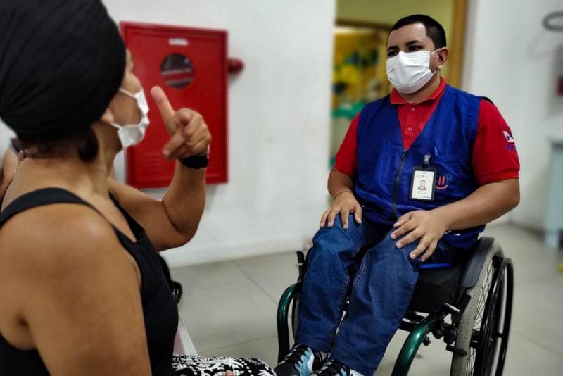 Apoio durante as consultasExperiência  - Entre os profissionais do CIIR que usam Libras na rotina pessoal e para auxiliar no atendimento aos usuários está o recreador do setor de Arte e Cultura Luan Almeida Tavares, 29 anos. Ele é surdo e também é atendido na instituição. “Uso Libras porque sou surdo, e isso facilita a comunicação com os outros usuários surdos. A gente faz a mediação dessa comunicação entre os colaboradores. Isso também nos oportuniza um ganho maior de experiência e essa empatia para com outras pessoas”, diz Luan, que faz parte do quadro funcional do CIIR desde outubro de 2019, por meio do Projeto de Empregabilidade para Pessoas com Deficiência (PcDs).