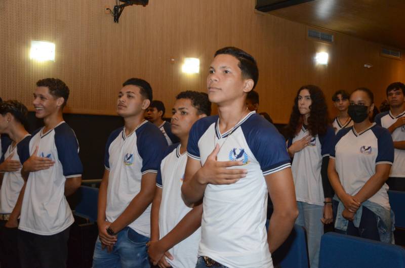Alunos das três séries do ensino médio público acompanham a execução do hino nacional no evento do ’Estágio Cidadão’ Durante o encontro, os alunos da escola Palmira Gabriel, Ruth dos Santos Almeida, Maria Gabriela Ramos de Oliveira e Raimundo Martins Viana, puderam conhecer sobre o programa e tirar algumas dúvidas sobre a oportunidade de ingresso ao estágio. Para Geovanna Santos, aluna do 2° ano, o programa vai ajudar a entender a profissão de cada candidato.