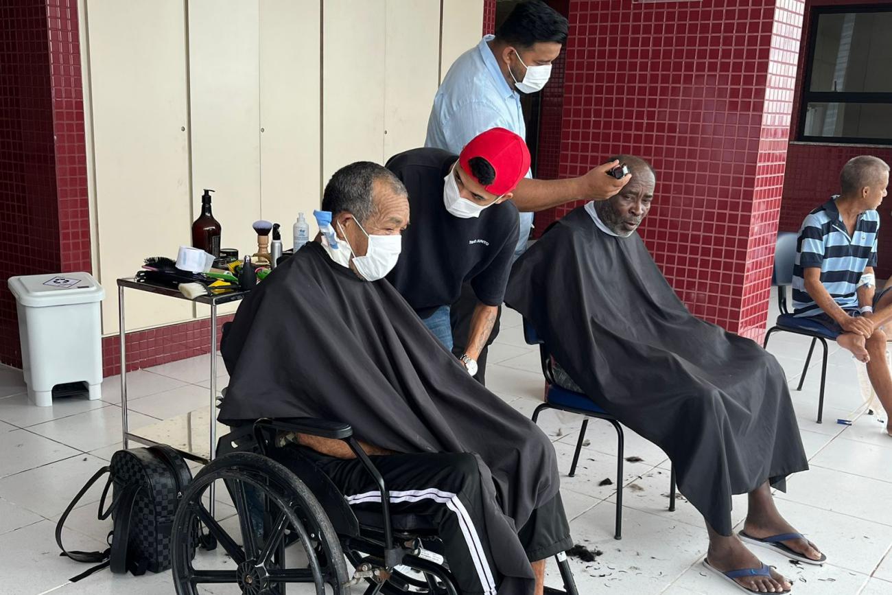 Acolhimento - Para Luid Devane, de 73 anos, morador da grande Belém, internado há 48 dias no HRAS para realizar terapia renal, a iniciativa trouxe um novo ânimo. “Eu achei muito interessante. Como estou aguardando vaga em outro serviço mais próximo de casa, às vezes a gente se sente sozinho e quando a equipe chegou, começou a cortar nosso cabelo, nos sentimos reconhecidos. Melhorou bastante a autoestima”, enfatizou.