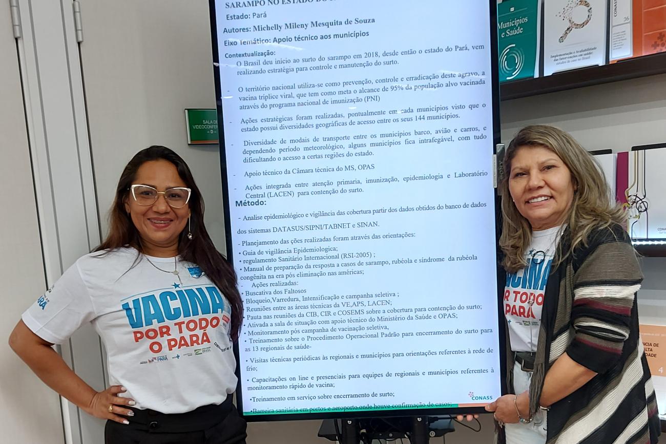 A Sespa esteve representada pela coordenadora estadual de Imunizações, Jaíra Ataíde, e pela técnica da Coordenação Estadual de Imunizações, Michelly de Souza, responsável pela apresentação da experiência paraense.