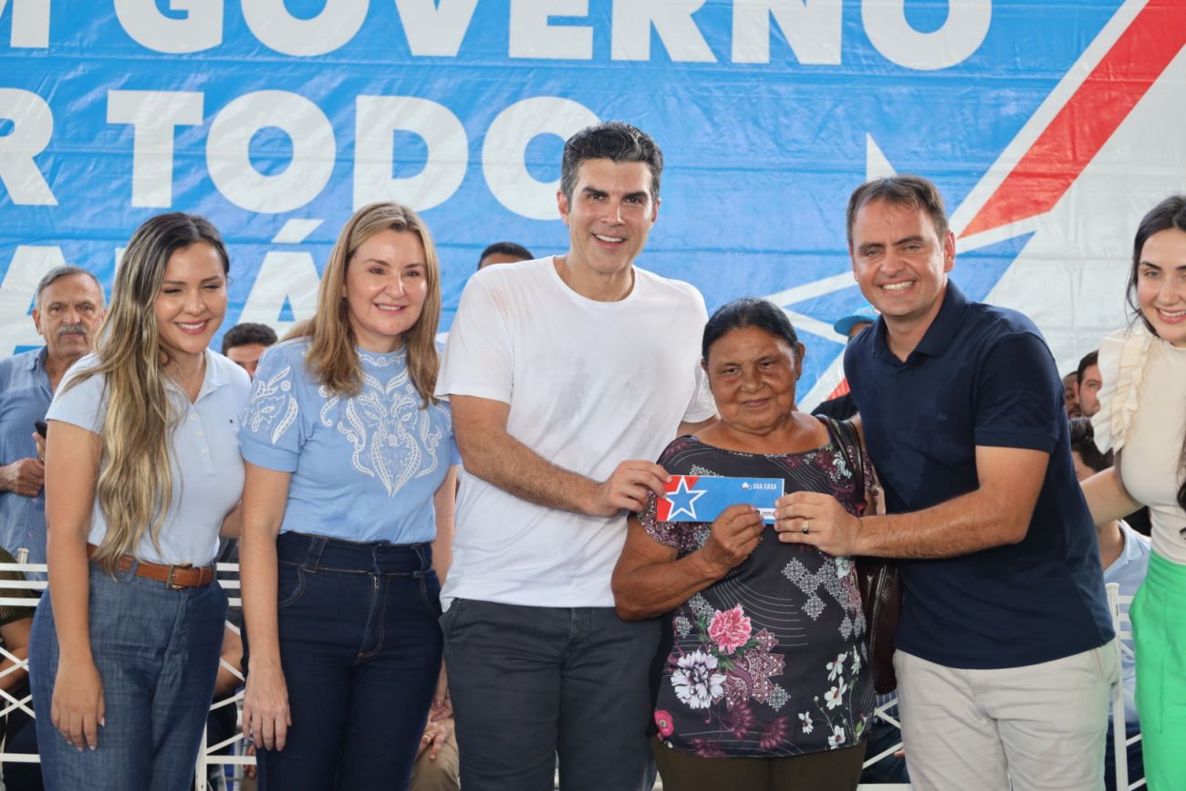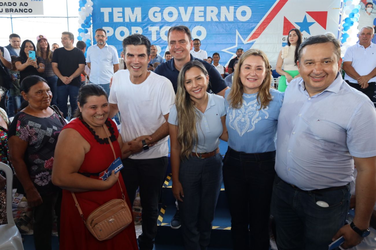 Governador Helder Barbalho e a vice-governadora Hana Ghassan com uma das beneficiadas pela política habitacional do EstadoApoio para construção e reconstrução de moradias, e benefícios para famílias atingidas pelas cheias de rios, foram garantidos pelo governo do Estado em Breu Branco, município da Região de Integração Lago de Tucuruí, no sudeste paraense. De uma só vez foram contempladas 418 famílias com cheques do Programa Sua Casa e 281 com auxílios do Programa Recomeçar.