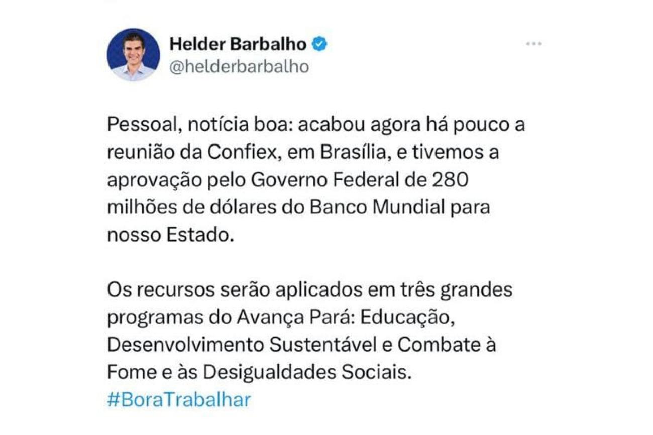 Novo aporte de recursos ao estado do Pará foi anunciado pelo governador Helder Barbalho nas redes sociais nesta sexta-feira (02).O acordo entre o governador Helder Barbalho com a Comissão de Financiamentos Externos (Confiex) da União vai firmar a destinação de US$ 280 milhões ao estado do Pará. Os recursos serão obtidos via Banco Internacional para Reconstrução e Desenvolvimento (Bird), e o Pará dará uma contrapartida de US$ 70 milhões, totalizando um investimento de US$ 350 milhões. O chefe do Executivo Estadual anunciou a novidade em postagem divulgada nas redes sociais.