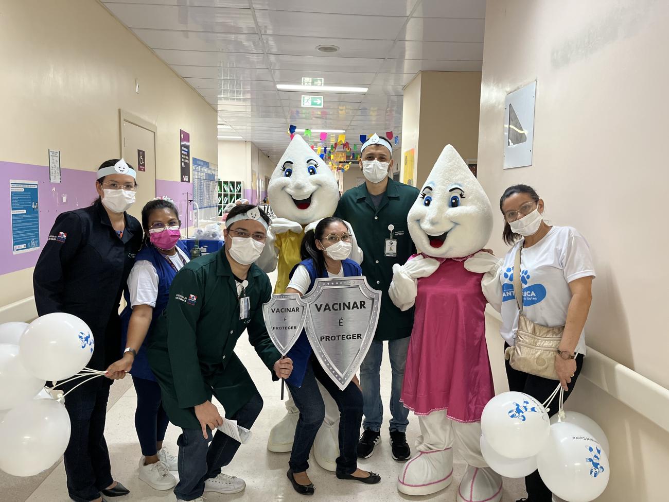 Equipe do Núcleo Hospitalar de Epidemiologia do Hoiol e equipe da SesmaO enfermeiro do Núcleo Hospitalar de Epidemiologia, Matheus Carvalho, explicou que “devido à sazonalidade e impacto clínico das infecções causadas por vírus respiratórios em crianças oncológicas, o hospital resolveu imunizar os acompanhantes para que sirvam de barreira e evitar que os vírus cheguem até os pacientes”. Ele também ressalta que público assistido pelo Hoiol possui critérios diferentes de vacinação, portanto segue um calendário especial conforme a orientação do oncologista, a depender da doença de base e da fase do tratamento.