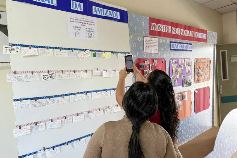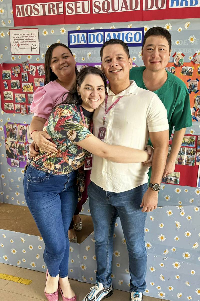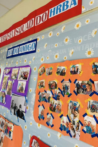 Mural da Amizade permite a interação entre os profissionais do HRBAOs enfermeiros Cristian Bento e Andrea Diniz; a fisioterapeuta Celiane Pedroso e o pediatra Marcelo Yokoyama colocaram uma foto do grupo no mural. Eles se conheceram há sete anos na Unidade de Terapia Intensiva (UTI) pediátrica do HRBA, e desde lá fortaleceram a amizade dentro e fora do local de trabalho.