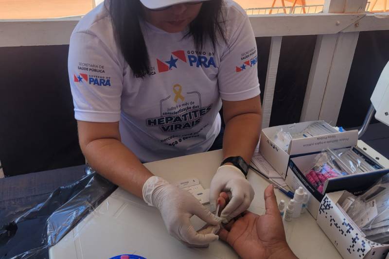 Servidora da Sespa colhe sangue para teste rápido de detecção de doenças, entre as quais a hepatite B, em SalinópolisUma equipe da Coordenação Estadual de Hepatites Virais da Secretaria de Estado de Saúde Pública (Sespa) esteve no Centro Integrado de Comando e Controle, na praia do Atalaia em Salinópolis, neste terceiro final de semana de julho. A equipe ofereceu para a população presente 212 testes rápidos de Hepatites B e C, sífilis e HIV, além de ter aplicado 89 doses de vacinas contra Hepatite B, Influenza, Menigocócica, febre amarela e Covid-19 na sexta, dia 21, e sábado, dia 22.