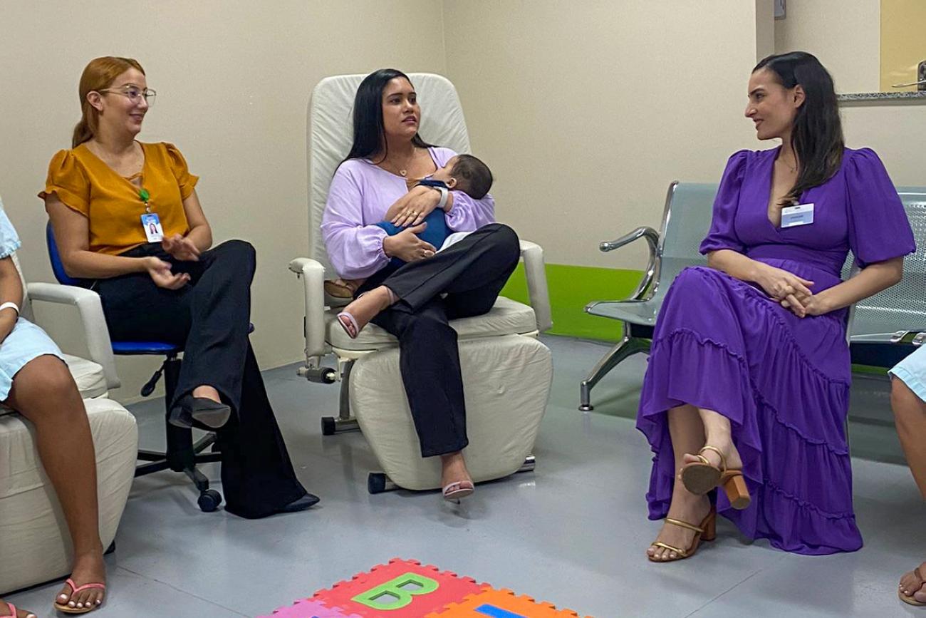 O encontro entre as mães marcou a abertura oficial da campanha na unidade. “O objetivo principal foi mostrar pra elas que também podemos fazer parte das suas redes de apoio durante o período pós-parto”, diz Thamires Magno, nutricionista responsável pelo banco de leite do Materno Infantil.