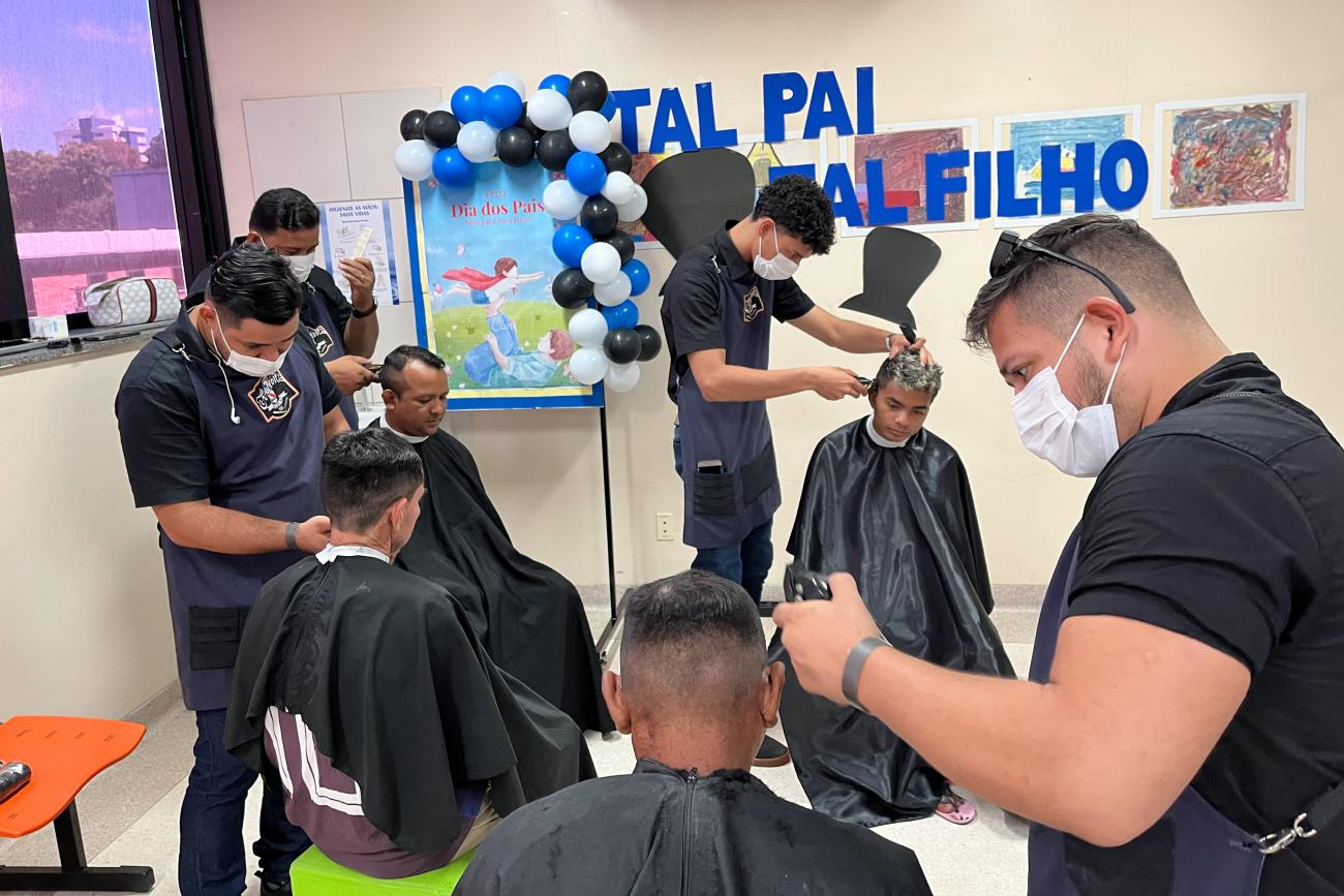 Na última sexta-feira (11), a brinquedoteca do segundo andar deu espaço para uma barbearia, na qual profissionais do ramo da beleza ofertaram cortes de cabelo e barba aos colaboradores e acompanhantes. Já neste sábado (12), o local reuniu pais e filhos em competições animadas. Houve ainda distribuição de brindes aos homenageados nas enfermarias da unidade.