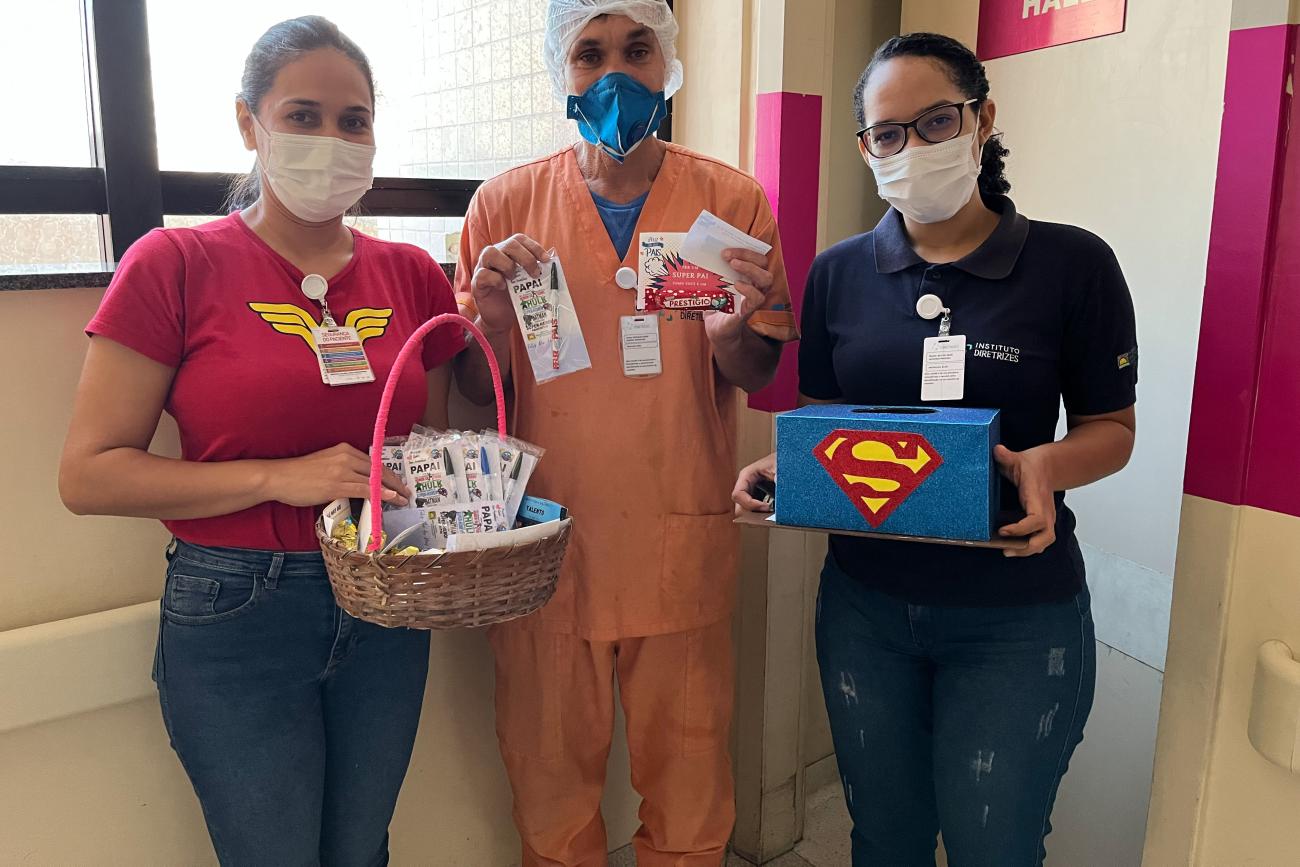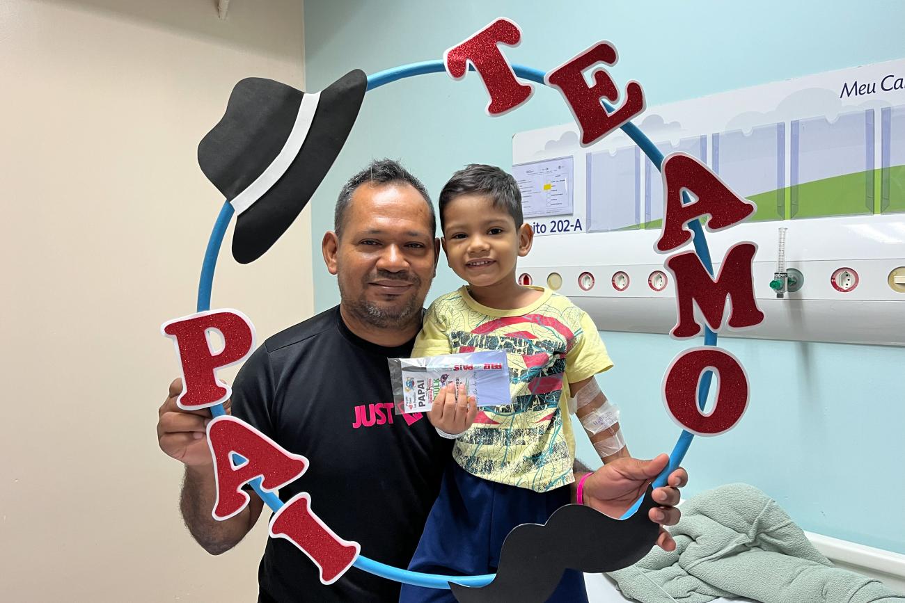 Na data em que se comemora a importância da figura paterna, o autônomo Reinaldo Nunes, de 46 anos, passará um Dia dos Pais diferente ao lado do filho, Ryan, de 3 anos. Será a primeira celebração da data longe de casa. “Meu sentimento nesse momento é de orgulho por ter sido lembrado. A gente não esperava estar em um hospital, mas o importante é estar com o meu filho junto e lutar nessa guerra”, afirmou ele ao receber um brinde e felicitações pela data.