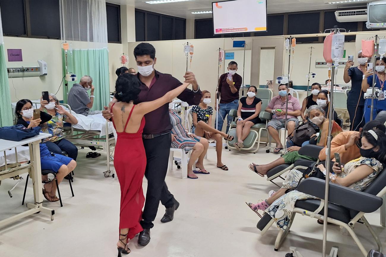 A técnica de enfermagem Cléia Penha, 42 anos, nunca imaginou que no primeiro dia de quimioterapia ela encontraria um salão de dança no Hospital Regional do Baixo Amazonas Dr. Waldemar Penna (HRBA), em Santarém, oeste do Pará. Os pacientes em tratamento na unidade prestigiaram a apresentação de dançarinos voluntários. Ela aprovou a recepção diferente.