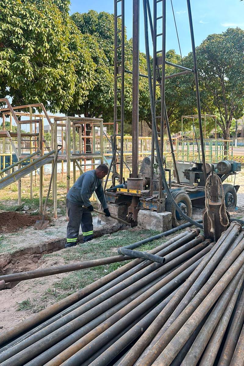 Os técnicos da Companhia executam a perfuração de um poço no sistema Júlia Passarinho, que atende os moradores dos bairros Santana, Santíssimo e parte do Prainha. Com investimentos do Governo do Estado, a estrutura será moderna e mais segura, chegando a 130 metros de profundidade.
