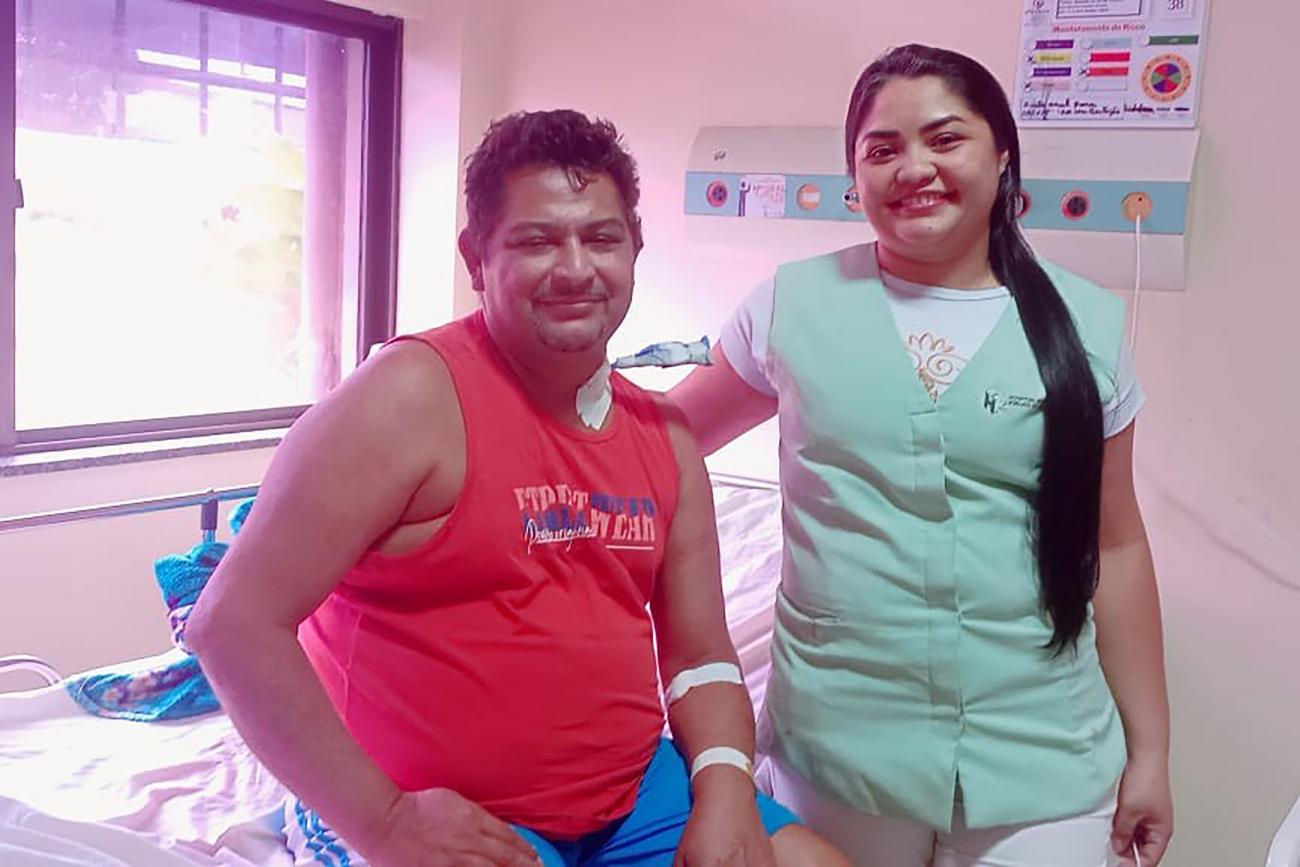 Usuário Benedito Tavares com Flávia Freitas, técnica de enfermagem do HRPM. janeiro deste ano. Ele relata satisfação quanto ao seu atendimento, acrescentando que os profissionais do HRPM lhe dão todo o suporte necessário. “O contato que tenho com os profissionais é fundamental, pois sem eles eu já teria desistido, porque não aguentaria sozinho. Eles sempre conversam comigo, me encorajando. Estou muito satisfeito com a forma que venho sendo tratado. Toda a equipe tem sido bem atenciosa. Posso dizer que construí uma relação de companheirismo e amizade com os profissionais, pois me trataram com muita humanidade, como se eu fosse alguém da família. Sou muito grato”, comentou o autônomo.