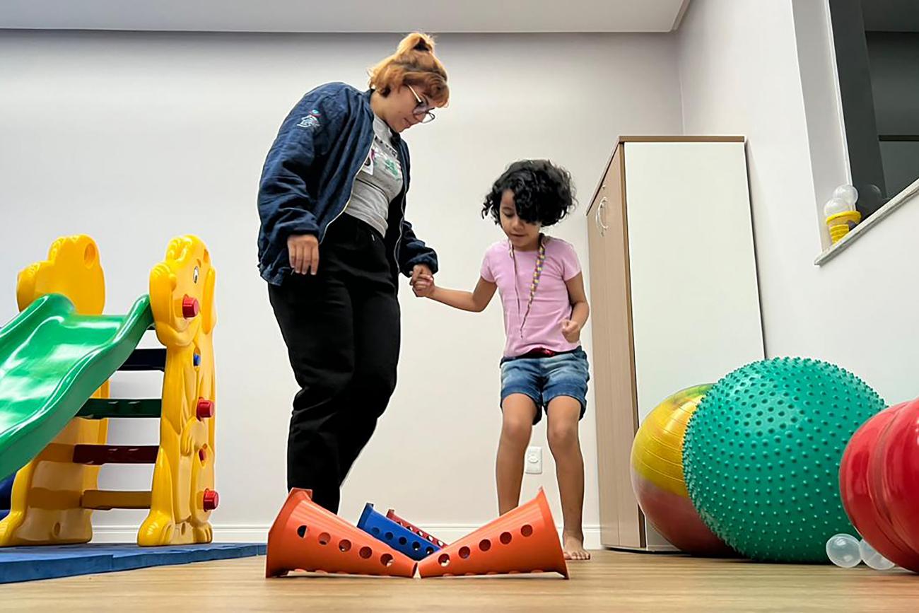 Suporte terapêutico – Entre as intervenções realizadas pela instituição, destaca-se a Terapia de Exercício em Movimento ofertada no Cetea. De acordo com a terapeuta que conduz a atividade, Beatriz Macedo, profissional de educação física, o plano terapêutico atua nos aspectos motores da criança para expandir o repertório motor com atividades de circuito.