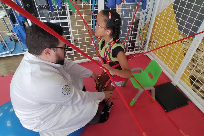 Pelo outro lado, no Centro Especializado em Reabilitação (CER IV), há cinco anos sendo acompanhada no CIIR passando por diversas terapias que a potencializa, Ana Maria Gomes, de 11 anos, utiliza em seu cronograma de reabilitação, a PediaSuit. Diagnosticada com Hidrocefalia e Mielologoncele, a garotinha condiciona a bipedestação, que é a posição ereta apoiada em ambos os pés, além de ser estimulada a cada grupamento muscular diferente.