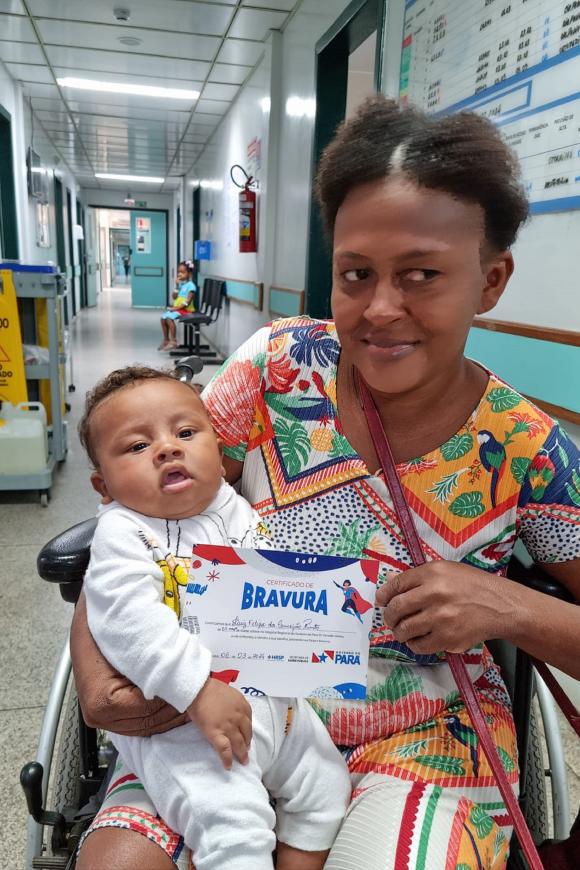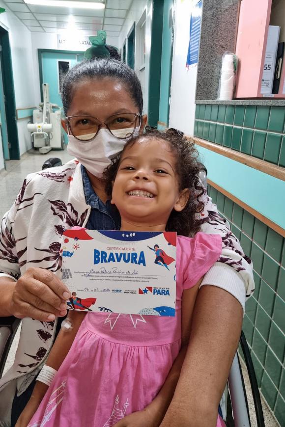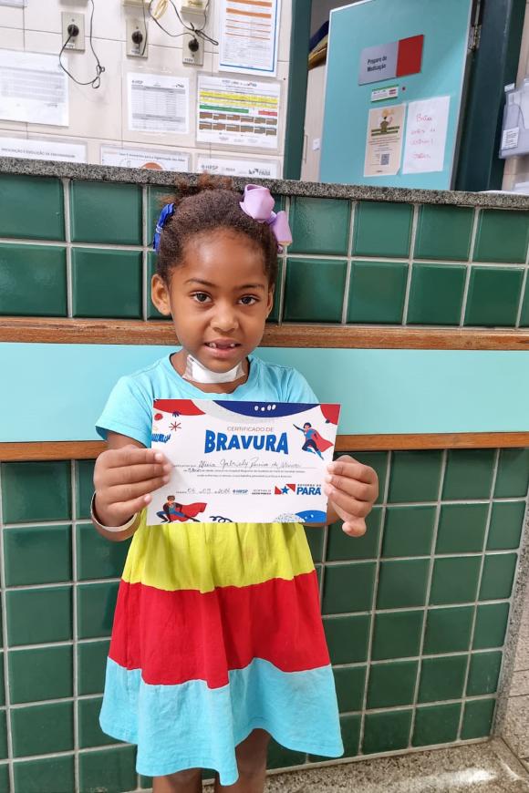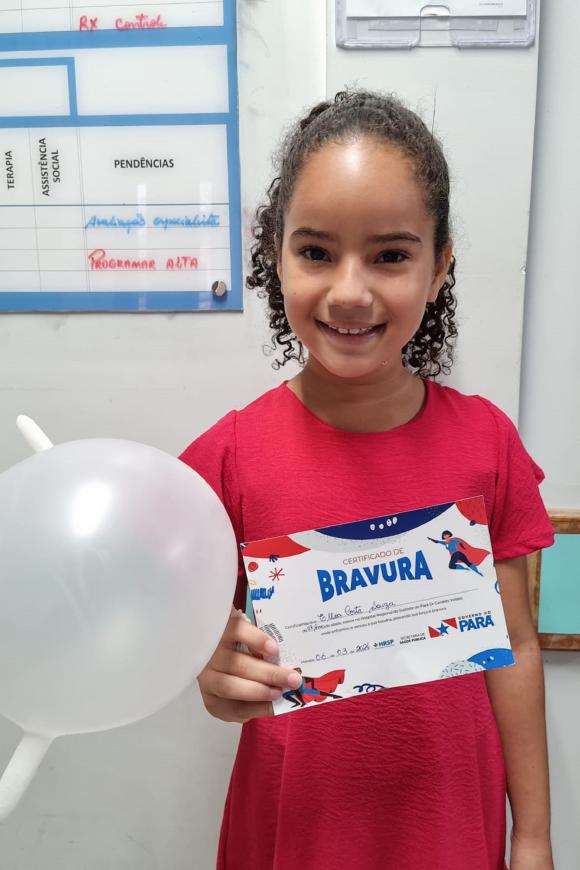 Elloá Costa Souza, 8 anos, residente de Marabá, passou alguns dias sob cuidados médicos na instituição. Ao receber alta, ela foi agraciada pelo projeto e recebeu com orgulho seu certificado. "Foi muito legal receber esse certificado. Me senti corajosa por ter enfrentado tudo isso", compartilhou a garota com um sorriso no rosto.