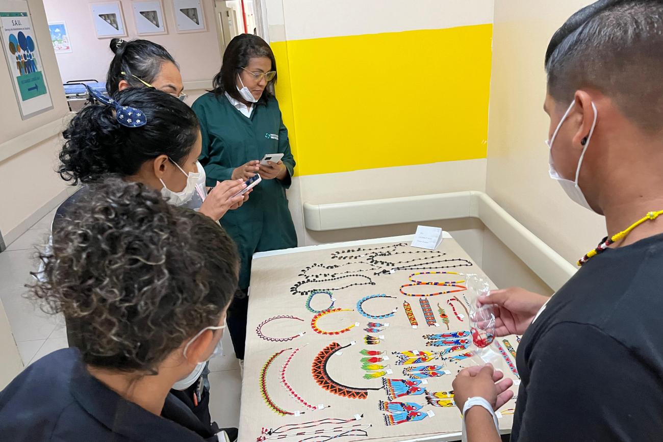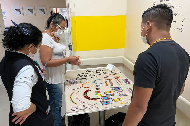Pai de uma menina em tratamento, Hokir Ka'apor confecciona pulseiras, brincos e colares para se manter em Belém, e agora participa do projeto desenvolvido pela unidade de saúde do Estado