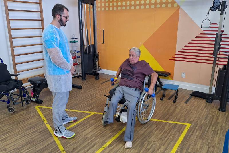 “A equipe multiprofissional está realizando, primeiramente, a pré-protetização. Estamos preparando o corpo dele para receber a prótese no pé direito. Porque não é somente instalá-la e andar. É necessário preparar o corpo para receber o estímulo e aceitar a prótese. Trabalhamos para o fortalecimento das articulações de membros inferiores e superiores, porque ele tem o diagnóstico de artrose e bursite nos ombros, por isso, a importância do fortalecimento muscular”, explica Samuel Pacheco, profissional de educação física que acompanha o reabilitando.