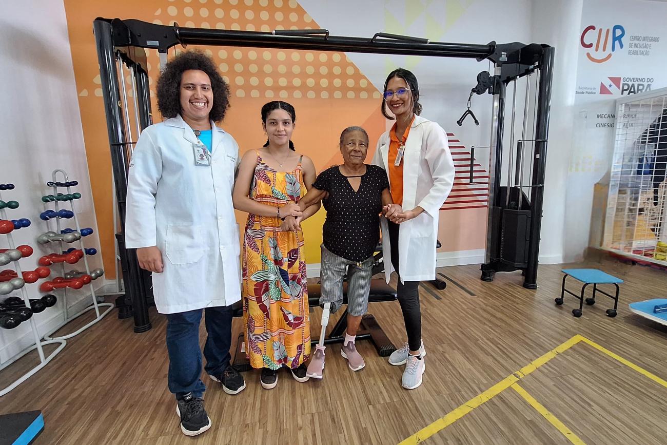Realizando reabilitação no CIIR há cerca de um ano e sendo sempre acompanhada da neta durante os atendimentos, Evaldina Farias, 74 anos, é assistida pela equipe multiprofissional com suporte de profissionais de educação física para a sua pré e pós-protetização. A neta, Gabriele Farias, de 20 anos, celebra o desenvolvimento da avó como presente na data que enfatiza a idosa.