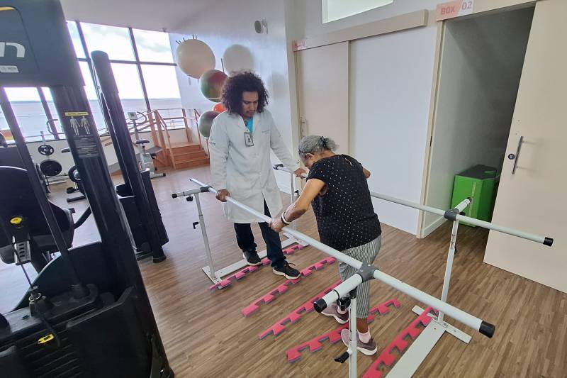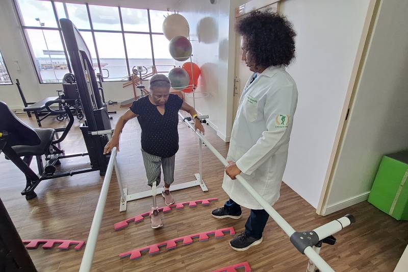 De acordo com Samila Ribeiro, profissional de Educação Física que acompanha a reabilitanda, a meta terapêutica tem o objetivo de fortalecimento muscular. “Estava com fraqueza muscular e como precisa apoiar o peso do corpo em, basicamente, só uma perna, tem a necessidade de fortalecer esse membro inferior. Realizamos um treinamento de força para melhorar a ‘caixinha respiratória’ utilizando a bicicleta ergométrica para que se sinta apta quando receber a prótese definitiva e não ter dificuldades, tanto fraqueza quando se levantar, quanto no momento de andar. Tudo pensando no dia a dia. Conversamos com a neta para que ajude sua avó com exercícios em casa. A prática no ambiente doméstico potencializa a evolução do plano terapêutico”, enfatiza a terapeuta.