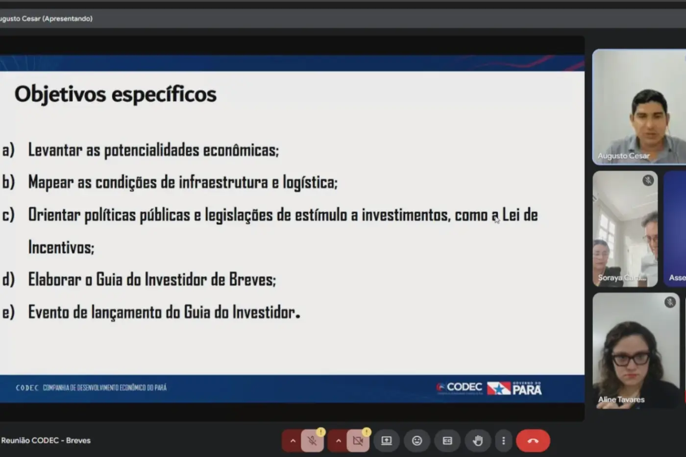 A Companhia de Desenvolvimento Econômico do Pará (Codec) realizou, nesta segunda-feira (4), uma reunião on-line com representantes da Prefeitura de Breves, no Arquipélago do Marajó. A ação faz parte da estratégia do governo do Estado para apoiar tecnicamente os municípios paraenses no processo de atração de investimentos, visando fortalecer o desenvolvimento local.