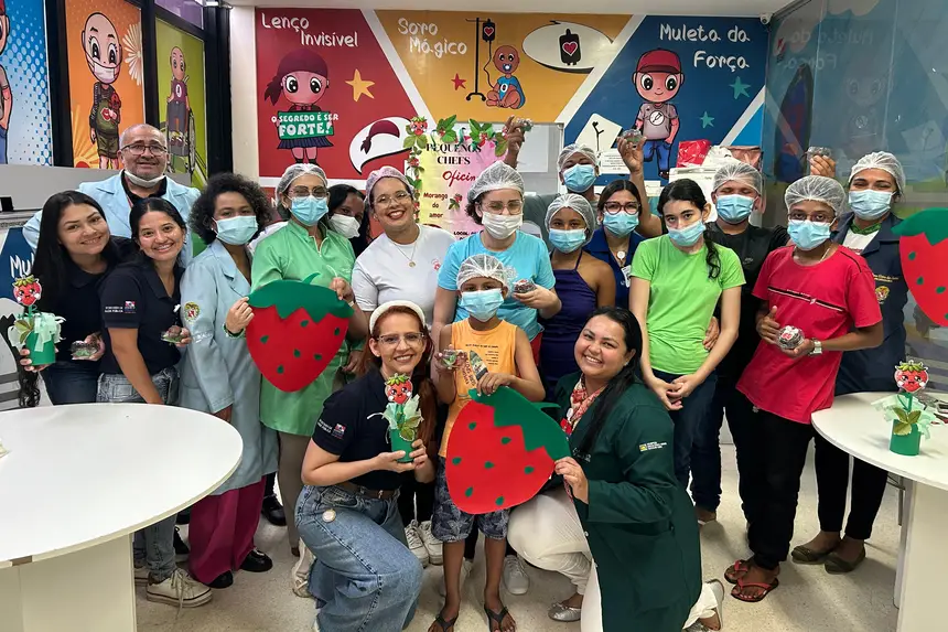 Em celebração ao Dia do Estudante, o Hospital Oncológico Infantil Octávio Lobo (Hoiol) promoveu, nesta quarta-feira (13), uma edição especial do projeto “Pequenos Chefs”, do Escritório de Experiência do Paciente (EEP), voltada aos alunos da Classe Hospital Professor Roberto França. A atividade ensinou a produção do “Morango do Amor”, doce que virou tendência nas redes sociais e encantou o paladar de crianças e adolescentes em tratamento na unidade hospitalar.