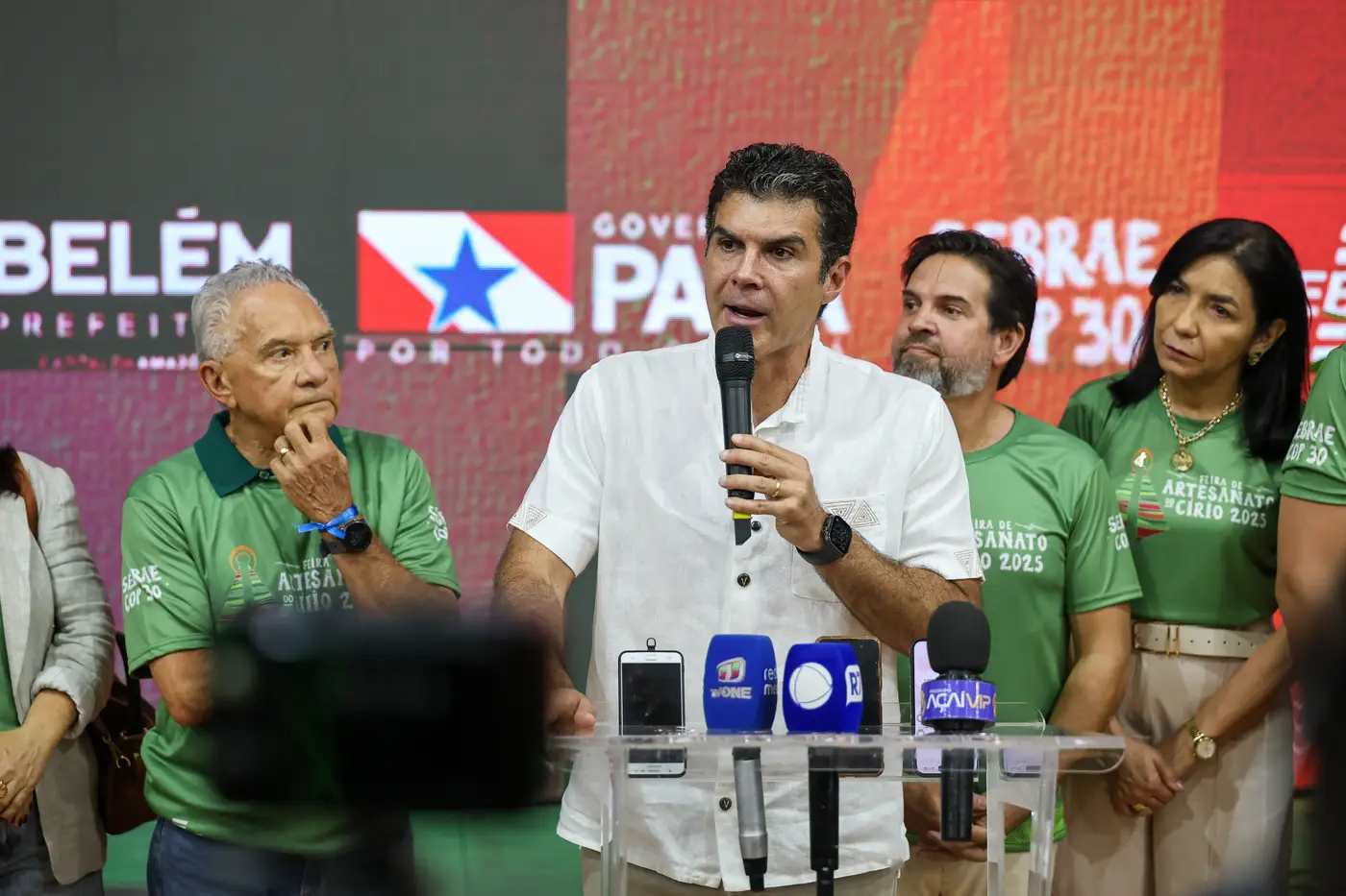 Governador, a vice-governadora Hana Ghassan e autoridades na abertura da Feira de Artesanato do Círio 2025