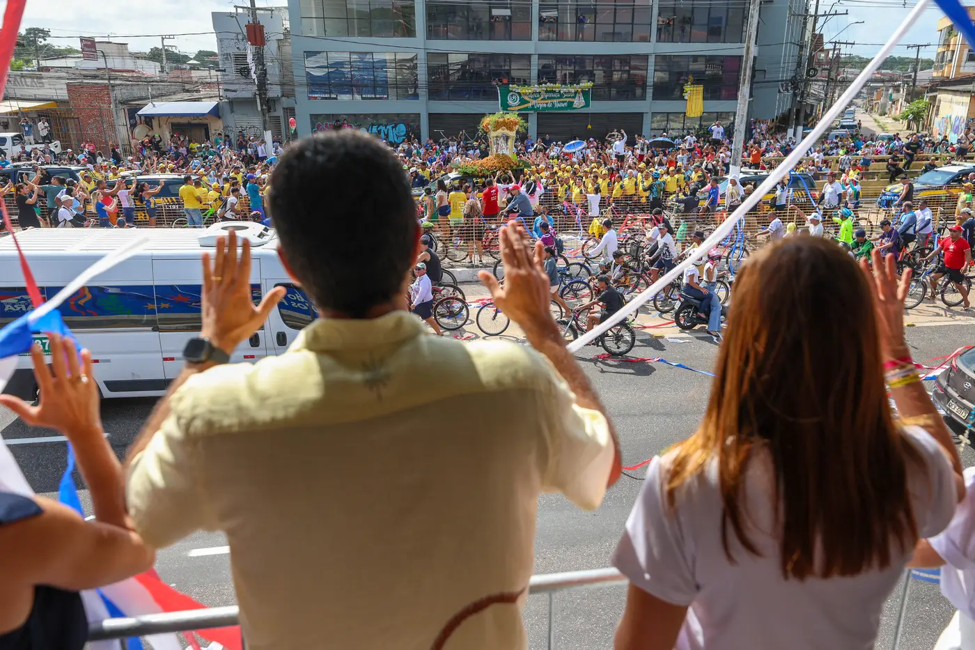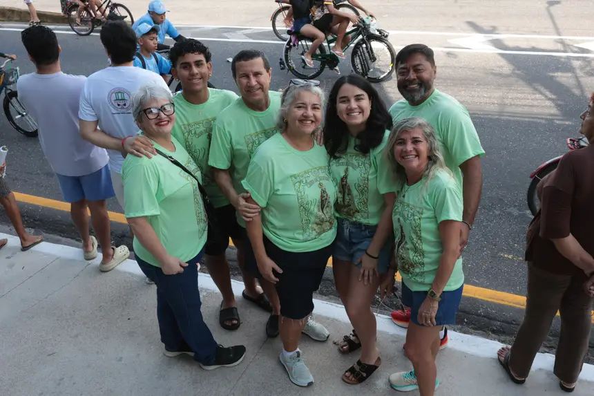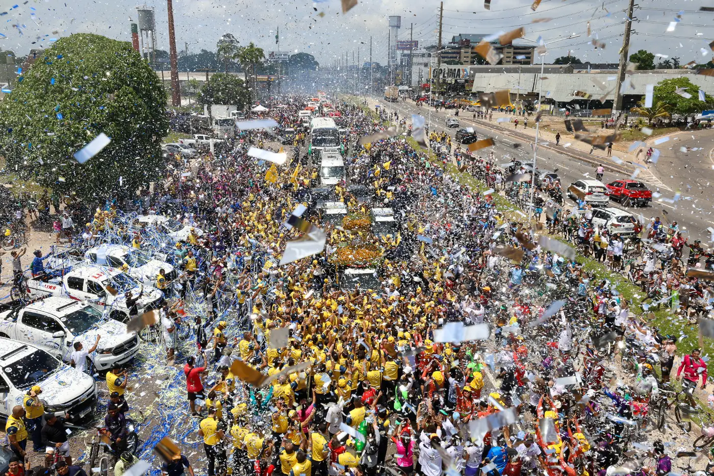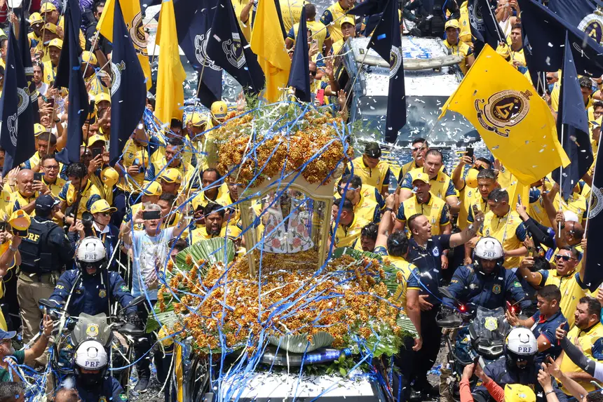 O carro com a berlinda é acompanhado por ciclistas, corredores e outros veículos. As calçadas e canteiros centrais ficam lotados de fiéis que aguardam para assistir a passagem da padroeira.