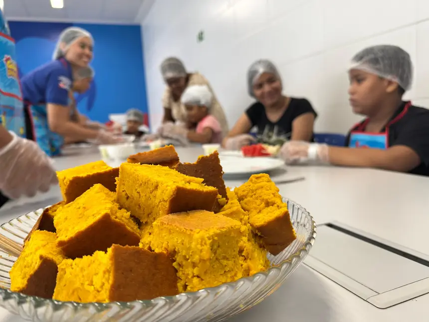No cardápio, espetinho, salada de frutas e bolo de cenoura com calda de chocolate 75% cacau foram preparados pelas crianças liberadas para participar da oficina.