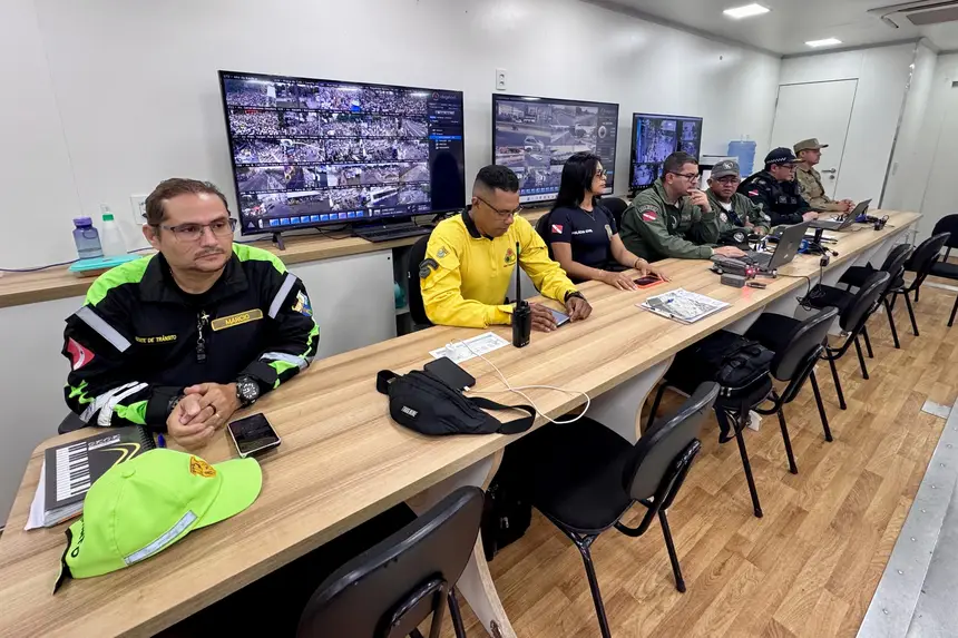 Do Centro Integrado de Comando e Controle Móvel, instalado na Avenida Nazaré, esquina da travessa Quintino Bocaiúva, os agentes de segurança monitoram, em tempo real, o movimento nas ruas por meio das mais de 60 câmeras da Segup distribuídas nas vias que fazem parte do cortejo, a fim de ter a visualização das ações e vias, e ainda, a garantir o contato com os agentes que estão nas vias e a tomada de decisão mais célere em caso de alguma intercorrência.