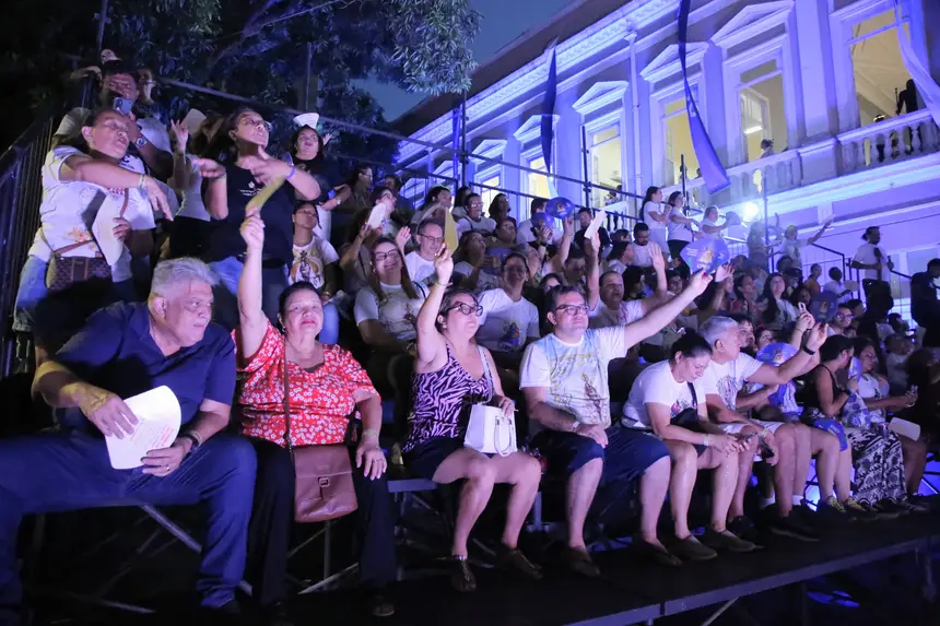 Uma noite de encanto e emoção marcou o sábado (11), durante a Trasladação, em Belém. Servidores da Secretaria de Estado de Educação (Seduc), que acompanharam a procissão da arquibancada, montada no Centro de Formação e Profissionais da Educação Básica do Estado do Pará (Cefor), no bairro da Campina, foram agraciados com a apresentação especial do coral das 25 crianças que, das históricas janelas do prédio centenário, do Cefor, mais conhecido como IEEP, cantaram em homenagem à Nossa Senhora de Nazaré, a padroeira dos paraenses.