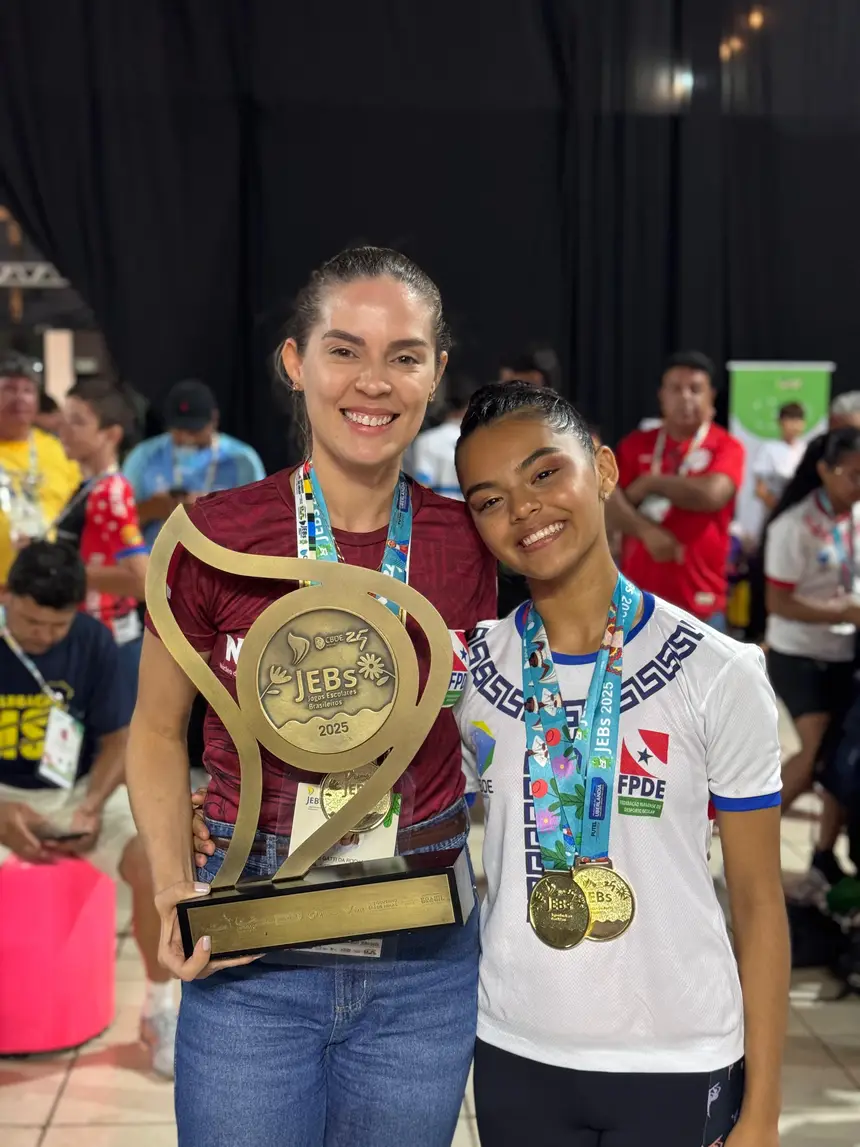 O Pará conquistou o ouro por equipe na ginástica rítmica, nos Jogos Escolares Brasileiros (JEBs) 2025, evento realizado em Uberlândia (MG). A delegação paraense contou com o apoio da Secretaria de Estado de Educação (Seduc), por meio do Núcleo de Esporte e Lazer (NEL), e se destacou nas provas individuais e coletivas. A estudante Júlia Nascimento, da Escola Estadual José Márcio Ayres, foi a única representante da rede pública estadual.