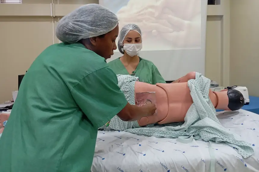 No curso, que teve a primeira edição no começo de setembro deste ano, equipes de Enfermagem, Medicina, Psicologia, Assistência Social, Nutrição, Fisioterapia, Fonoaudiologia e Farmácia, ministram aulas teóricas e práticas. A Comissão de Feridas também compõe o treinamento e é responsável por ensinar como o paciente acamado, depois de receber alta hospitalar, deve ser assistido em casa, a fim de evitar feridas por pressão ou higienizá-las corretamente.