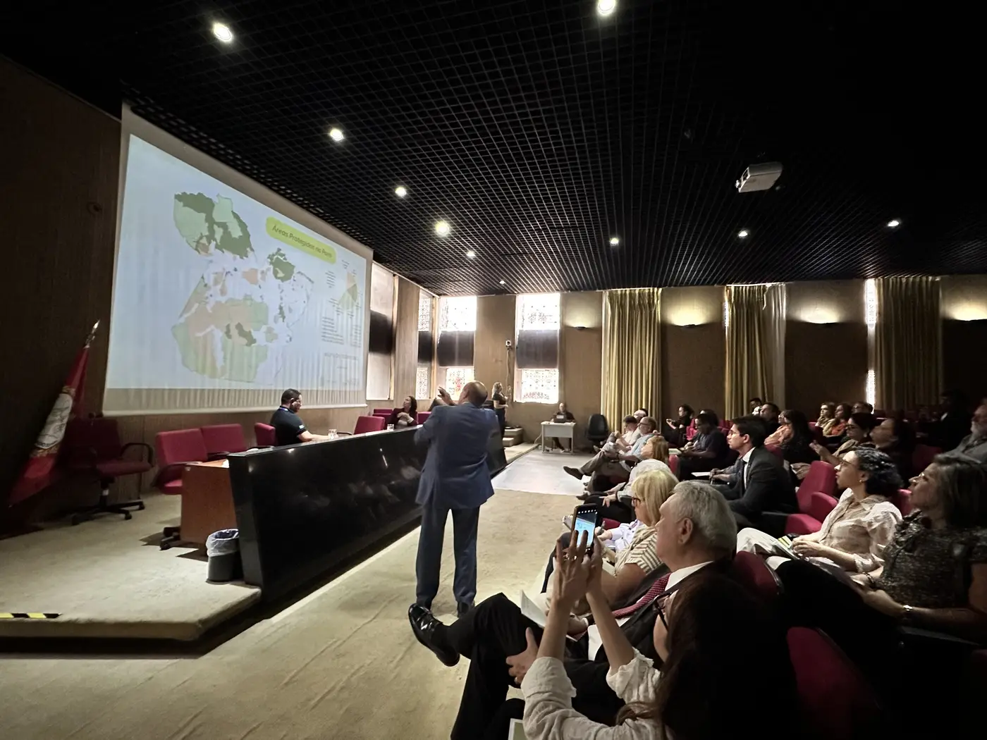 O presidente do Ideflor-Bio, Nilson Pinto, apresentou a palestra “A ação do Ideflor-Bio no Combate às Mudanças Climáticas”, destacando as políticas públicas e projetos conduzidos pelo órgão. O público era formado por membros e servidores do MPPA, estudantes, especialistas, trabalhadores rurais e representantes da sociedade civil organizada.