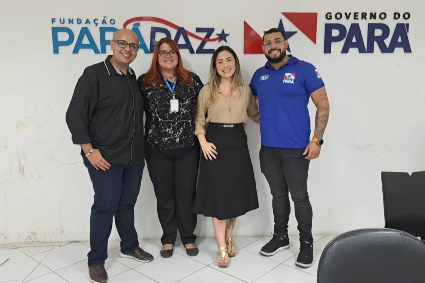 Os professores Leonardo Gurjão e Renan Freitas ao lado da coordenadora Beatriz Lopes durante a certificação dos alunos na Fundação ParáPaz