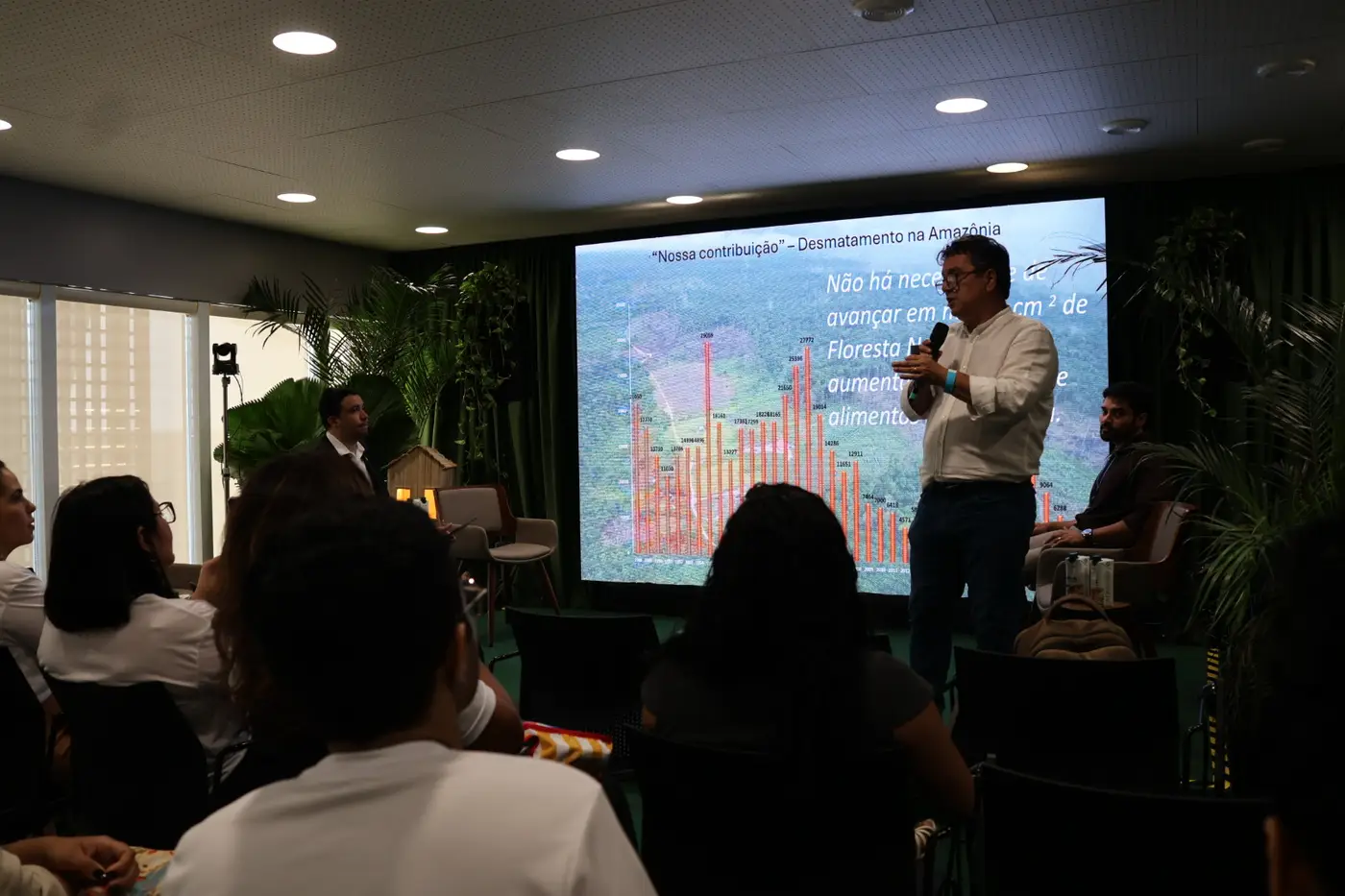 Durante o painel, o pesquisador da Empresa Brasileira de Pesquisa Agropecuária (Embrapa), Adriano Venturieri, apresentou propostas de tecnologias voltadas ao desenvolvimento sustentável, com ênfase na integração lavoura-pecuária-floresta (ILPF) e em ações de restauração de áreas desmatadas, enquanto o professor Maurício Moura, do curso de Meteorologia da Universidade Federal do Pará (UFPA), expôs dados sobre os riscos e impactos climáticos para as populações amazônicas.