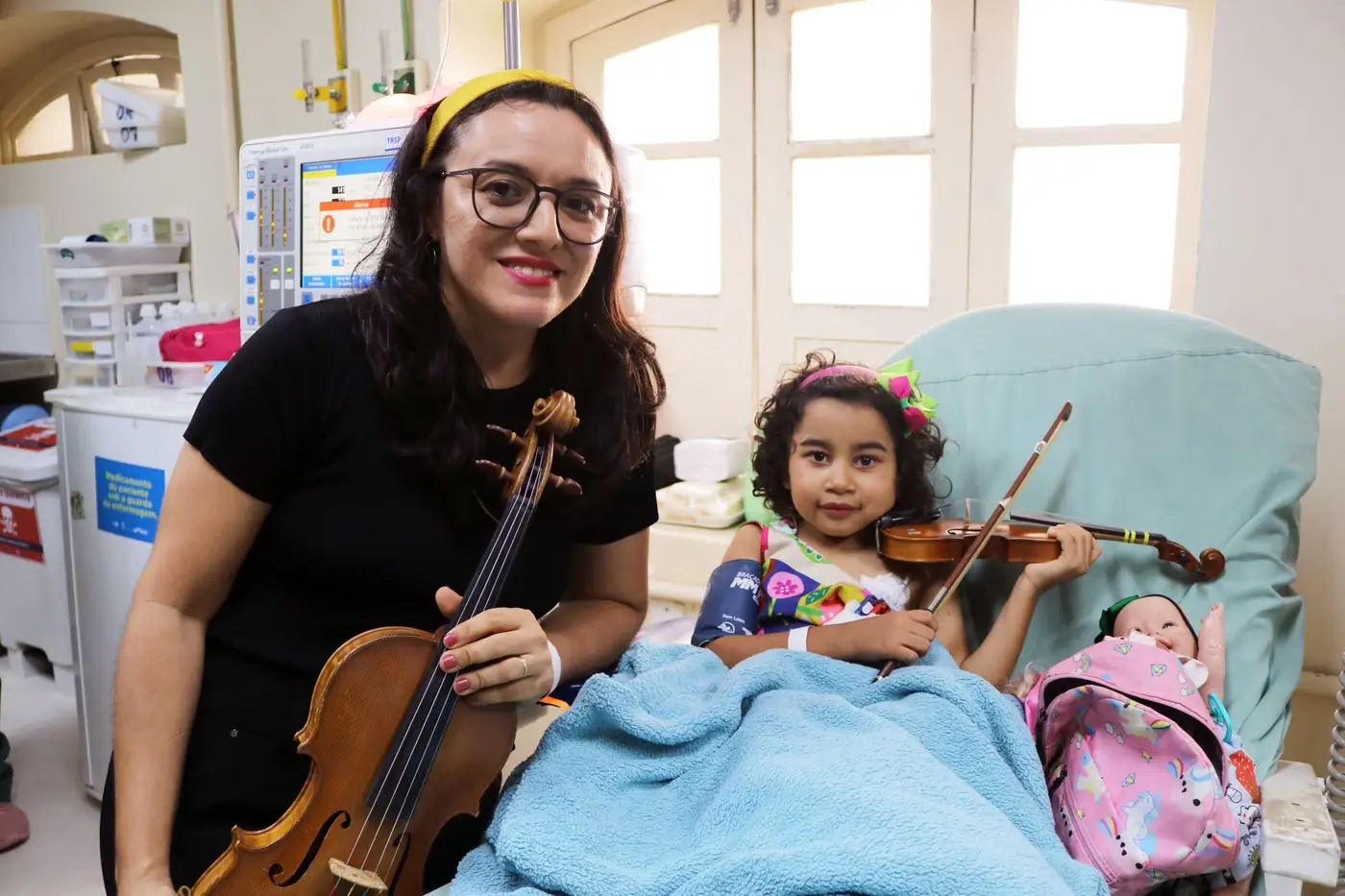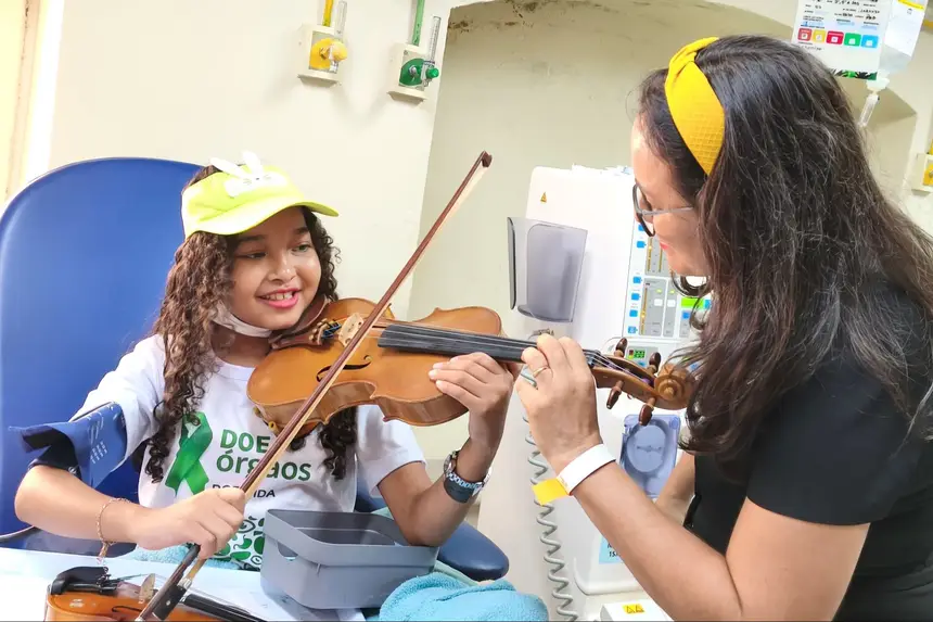 “A música, ela aguça a memória, a concentração, a noção da figura daquilo que ela está ouvindo, que é a percepção do objeto, os estímulos sensoriais, porque ouvir a música e sentir é diferente. Sentir o som do violino faz com que a criança conheça outros sons, não só o som da dor, subjetivamente falando, porque o som da dor é só ver o curativo que é feito. Então, estimula os aspectos cognitivos, mas também os sociais, pois eles querem pegar, eles querem falar, eles querem conhecer. Ao mesmo tempo, possibilita uma saúde mental, porque dispersa a condição só da dor, mas possibilita eles entenderem que mesmo em um ambiente crônico de tratamento, eles podem ter outras experiências”, conclui.