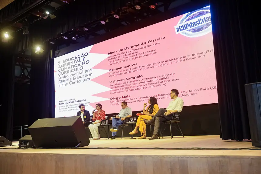 Durante a programação da 30ª Conferência das Nações Unidas sobre Mudanças Climáticas (COP30), em Belém, a Secretaria de Estado de Educação (Seduc), em parceria com o Instituto Alana, promoveu nesta quarta-feira (12) um evento alusivo ao Dia da Educação, com foco na inserção da pauta climática nas políticas pedagógicas.
