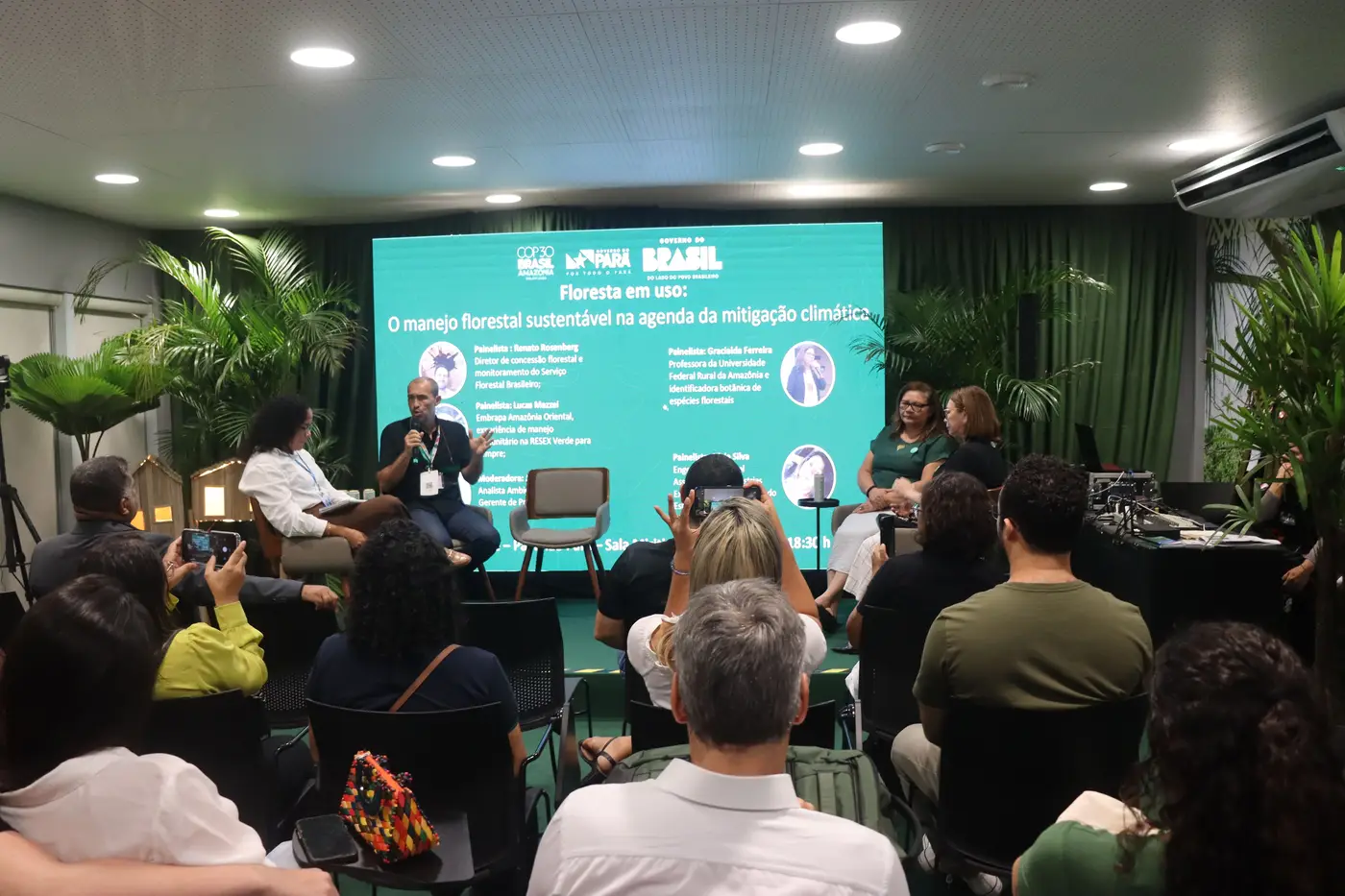 O manejo florestal sustentável esteve no centro do debate na Sala Miritizeiro, no Pavilhão Pará, na programação da COP30 de quinta-feira (13). O painel “Floresta em uso: o manejo florestal sustentável na agenda da mitigação climática” reuniu especialistas que atuam diretamente na pesquisa, no uso e na gestão da floresta amazônica. A mediação foi conduzida por Jessica Cabral, servidora da Secretaria de Estado de Meio Ambiente, Clima e Sustentabilidade (Semas).