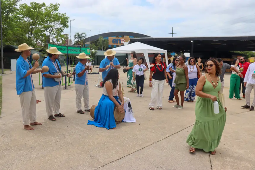 Instalado no Porto Futuro I, contêiner criado pela Secretaria de Meio Ambiente, Clima e Sustentabilidade (SEMAS), valoriza indígenas, quilombolas e extrativistas, reforçando a valorizacao do conhecimento tradicional na agenda de bioeconomia.