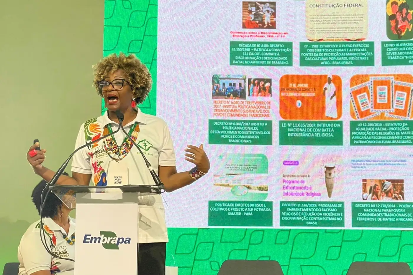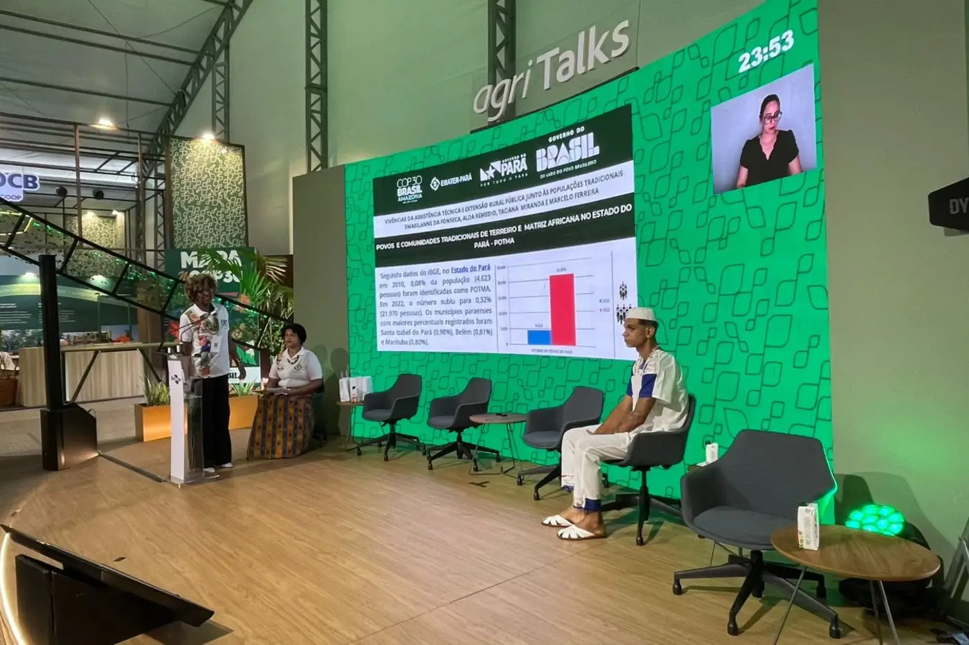 A Arena Agri Talks, na AgriZone, instalada na sede da Empresa Brasileira de Pesquisa Agropecuária (Embrapa) da Amazônia Oriental, foi palco de debate sobre as políticas públicas para Povos Tradicionais de Matriz Africana (Potma), neste domingo (16), durante a programação da Conferência das Nações Unidas sobre Mudança Climática do Clima (COP30), em Belém.