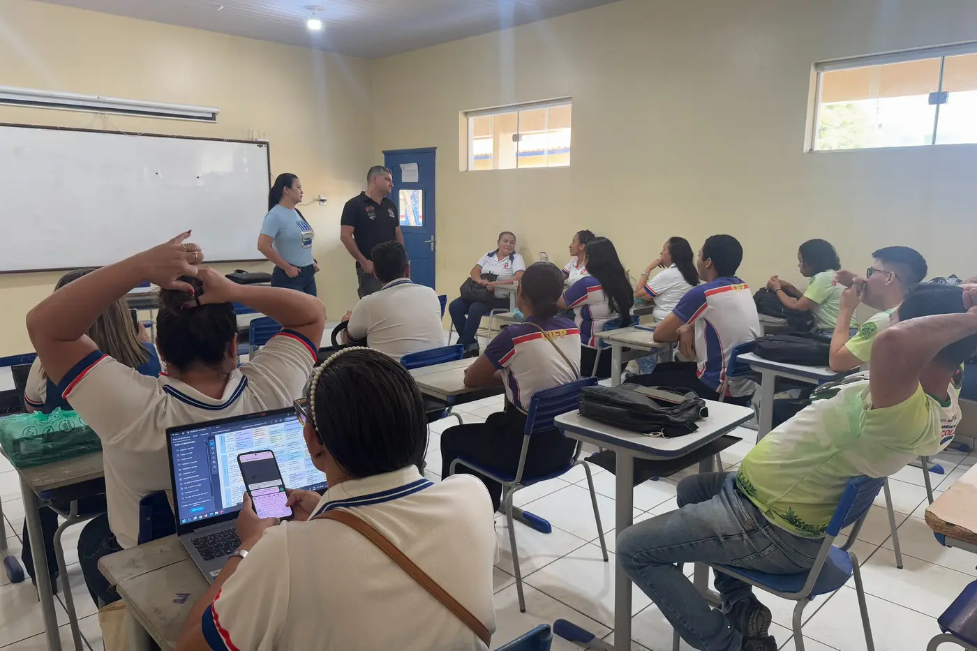 O secretário de Educação, Ricardo Sefer, esteve acompanhado da secretária-adjunta de Logística da Seduc, Kassumi Kyushima, reforçando a articulação entre infraestrutura, gestão pedagógica e atendimento às demandas da rede.
