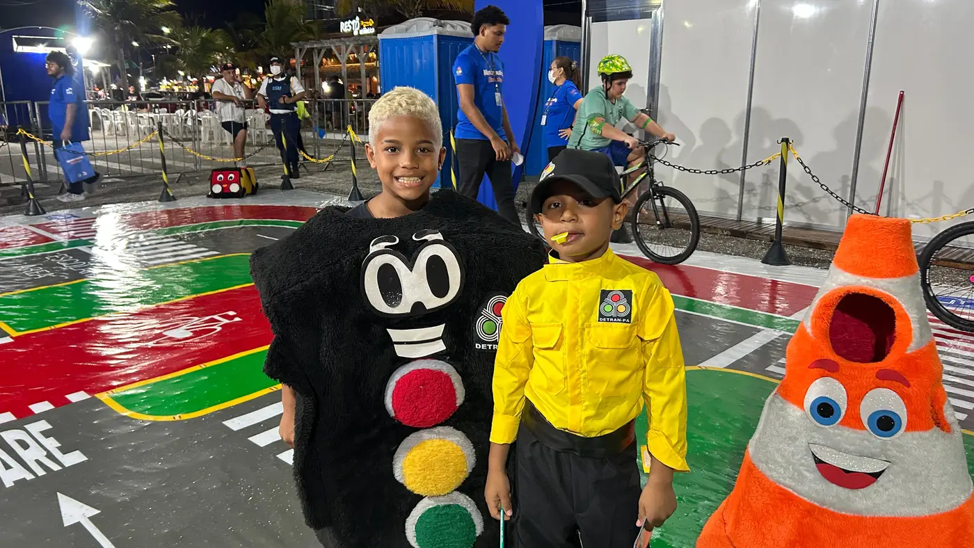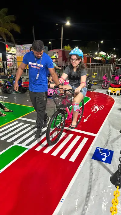 Durante a noite, as ações educativas do Detran ganham um caráter lúdico e pedagógico, voltado especialmente ao público infantil, por meio do Minicircuito Itinerante. A iniciativa tem como objetivo ensinar, de forma prática e acessível, as regras básicas de um trânsito seguro, estimulando desde cedo comportamentos responsáveis e conscientes.