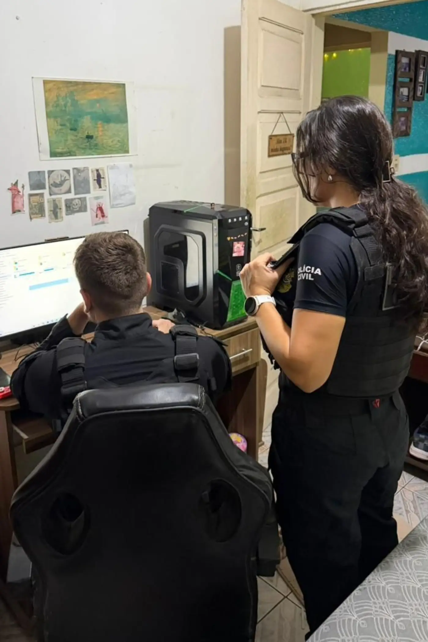 Durante a ação, foram cumpridos três mandados judiciais de busca e apreensão domiciliar no bairro de Fátima, em Belém, no contexto de investigação que apura o armazenamento de material de abuso sexual infantojuvenil em dispositivos eletrônicos.