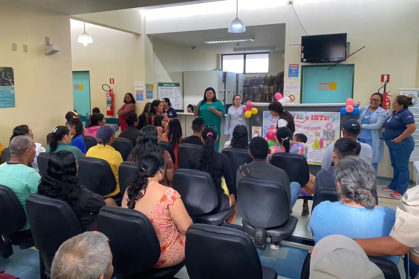 A atividade ocorreu nas áreas de recepção da unidade e envolveu usuários, acompanhantes e colaboradores, com orientações educativas sobre prevenção, formas de transmissão, importância do diagnóstico precoce e cuidados com a saúde.