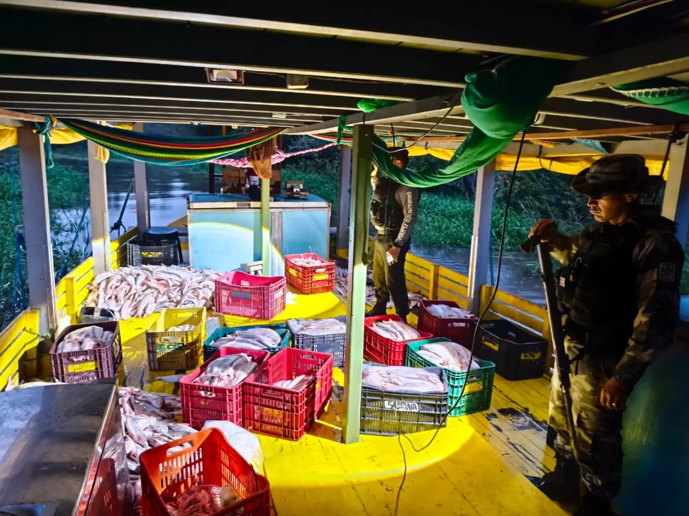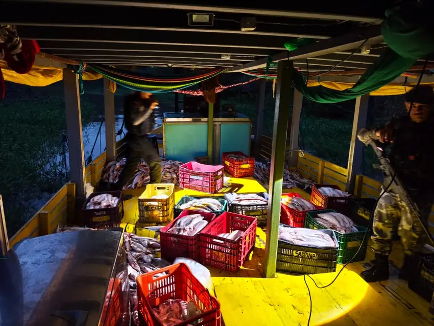 Durante a averiguação em campo, as equipes localizaram uma embarcação de pequeno porte escondida em um “furo de rio”. No interior, foi constatado o transporte irregular de cerca de cinco toneladas de mapará, espécie protegida neste período. O comandante da embarcação foi identificado com mais duas pessoas.
