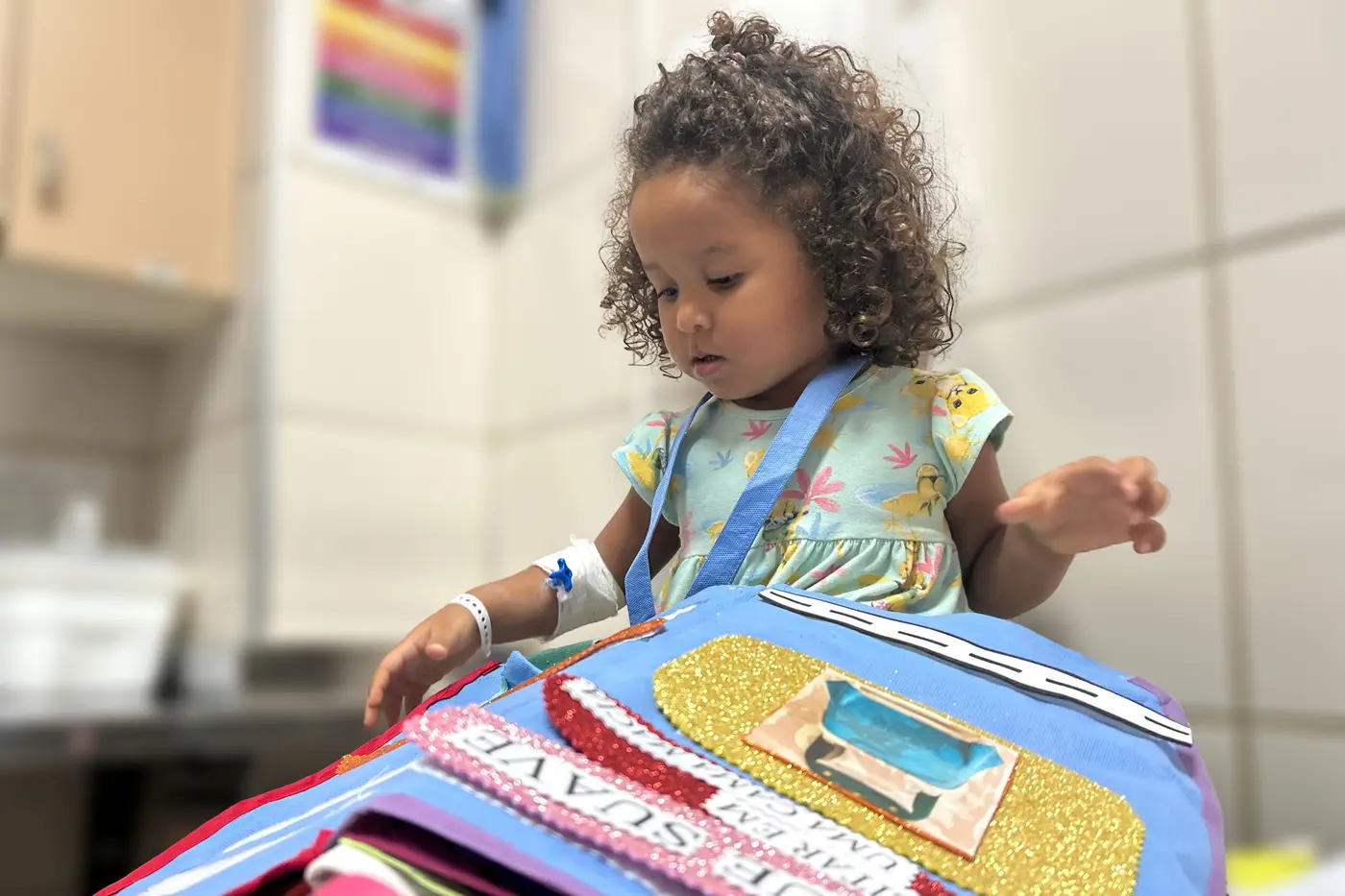 Sara, de dois anos, interagindo com o livro sensorial antes da tomografia