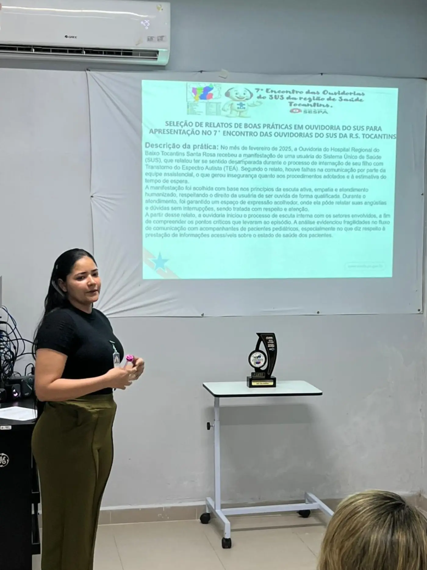A entrega da premiação ocorreu na manhã desta quinta-feira (19), no 6º Centro Regional de Saúde Tocantins. O troféu referente ao 1º lugar foi entregue por Núbia Casais, Ouvidora SUS e Murilo Elder, Responsável Técnico pela Humanização. Isso foi feito em reconhecimento à boa prática desenvolvida em 2025 no âmbito da Ouvidoria do SUS no Hospital Regional do Baixo Tocantins Santa Rosa.