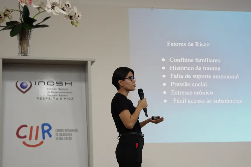 A atividade foi conduzida pela psicóloga do CIIR, Kássia Costa de Souza, que abordou aspectos psicológicos relacionados ao uso de substâncias e à dependência química. Ela detalhou, na apresentação, que a dependência é reconhecida pela Organização Mundial da Saúde (OMS) como um transtorno mental e comportamental, envolvendo alterações no cérebro, perda de controle sobre o consumo e impactos emocionais e sociais.