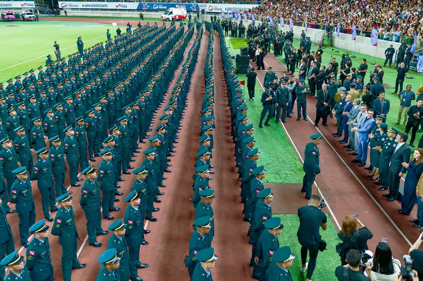 O Governo do Pará realizou, nesta terça-feira (24), a formatura de 963 novos soldados do Curso de Formação de Praças (CFP) da Polícia Militar do Pará. A solenidade ocorreu no Estádio Mangueirão, em Belém, e foi presidida pelo governador Helder Barbalho e pela vice-governadora Hana Ghassan, reunindo autoridades militares, familiares e convidados. Os novos policiais estão aptos a integrar as fileiras da corporação e atuar em prol da segurança e do bem-estar da população paraense.