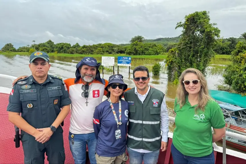 A Secretaria de Estado de Meio Ambiente, Clima e Sustentabilidade (Semas) participou da entrega do flutuante de monitoramento do Lago de Sapucuá, em Oriximiná, no oeste do Pará, com a presença do secretário adjunto de Gestão de Regularidade Ambiental, Rodolpho Zahluth Bastos, da gerente-geral de Relacionamento e Responsabilidade Social Corporativa da Mineradora Rio do Norte (MRN), Jéssica Naime, do diretor administrativo da Associação das Comunidades das Glebas Trombetas e Sapucuá (ACOMTAGS), Emerson Carvalho, e da presidenta do Instituto Igarapé Nhamundá, Maria Cristina Feijão.